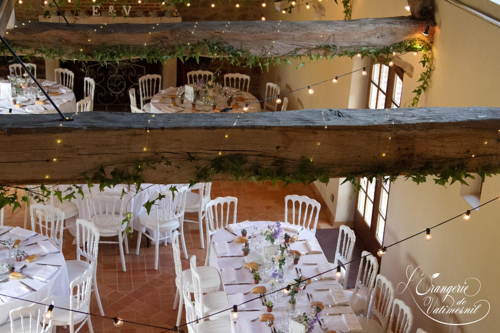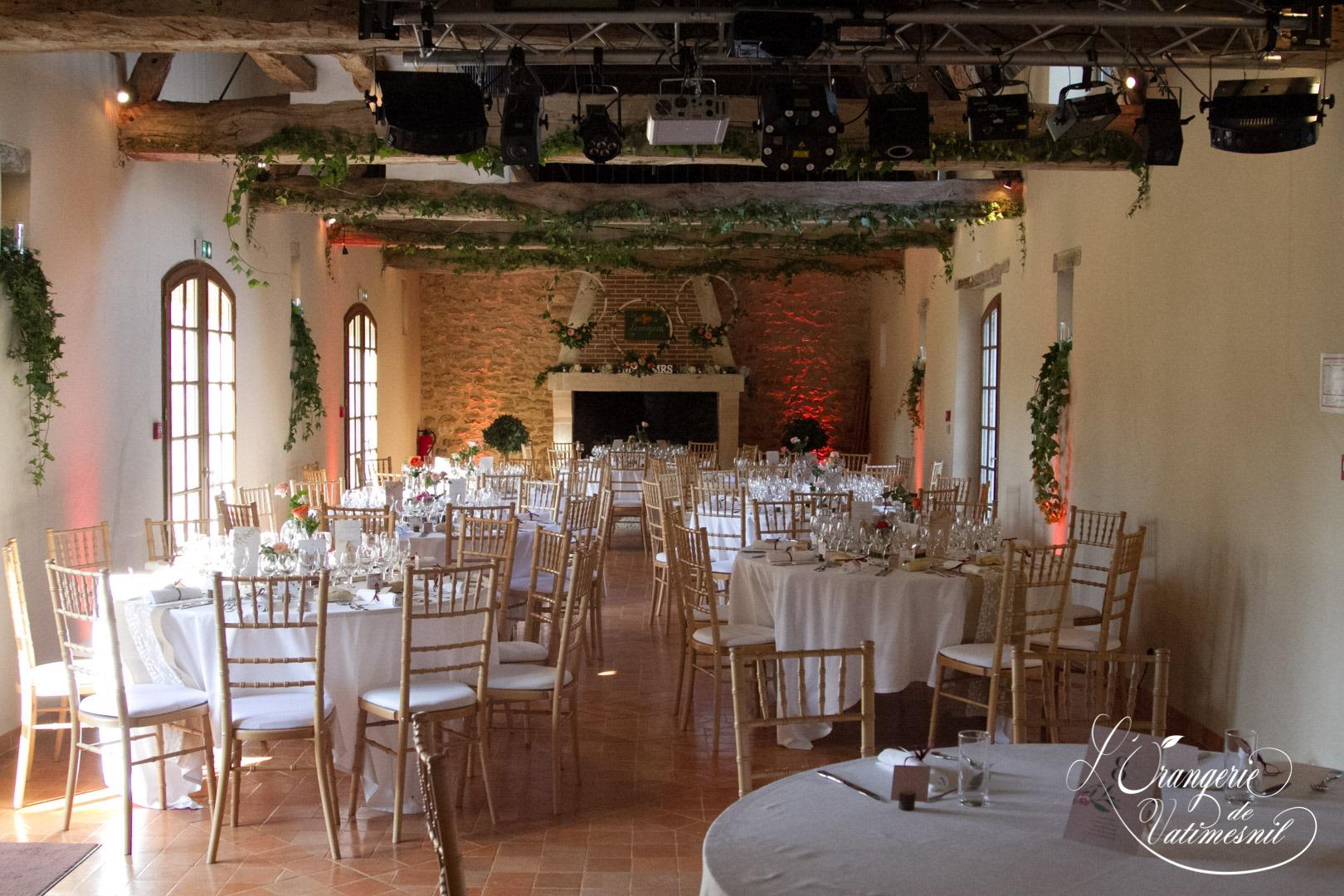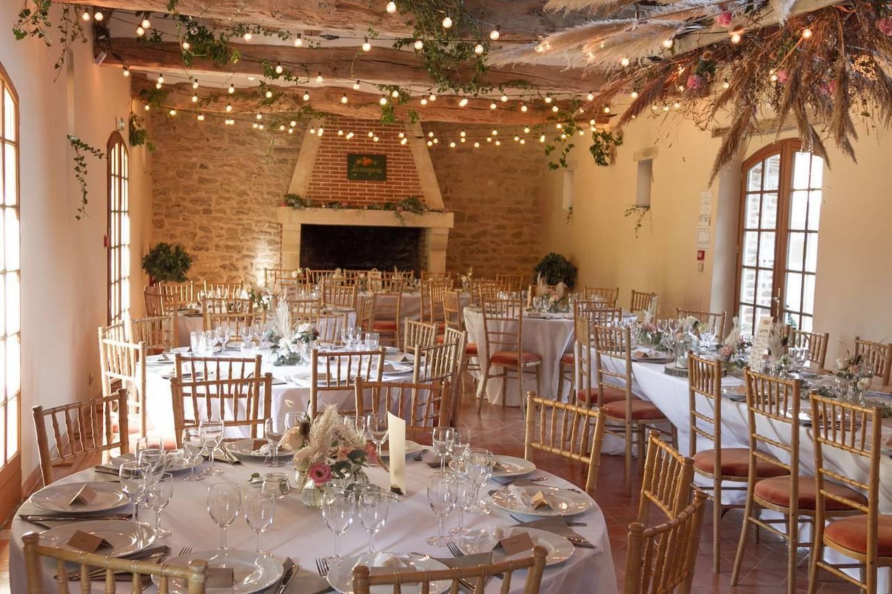 L'Orangerie, ses deux mezzanines et sa cheminée vous offrent un cadre chaleureux pour recevoir 100 convives en dîner assis. Côté jardin, la terrasse en briques anciennes, le jardin et ses massifs floraux, la roseraie et le verger sont autant d'endroits charmants et bucoliques pour les photos et pour accueillir buffets et cocktails de mai à septembre exclusivement.